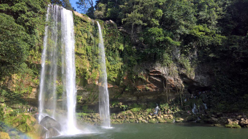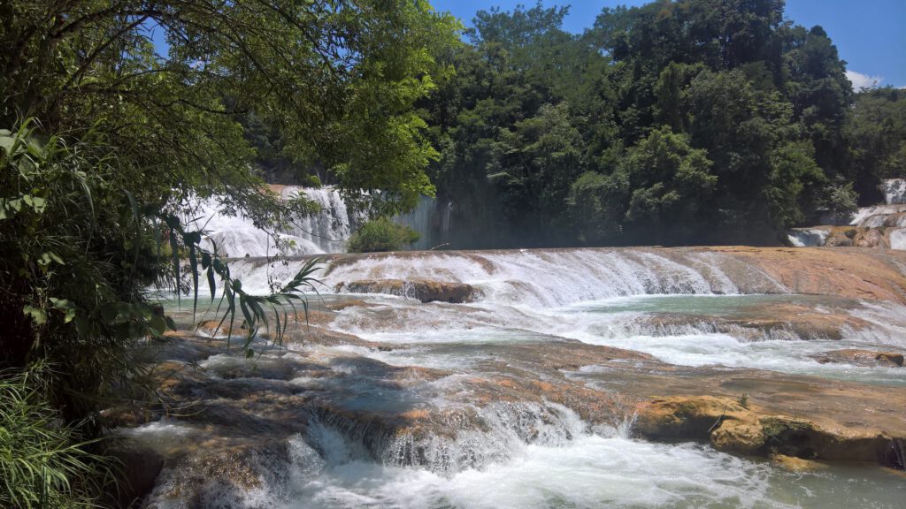 In tegenstelling tot het niet-toeristische Welib-Ja is een andere natte bestemming, genaamd Aguas Azul (=Blauwe wateren), wél toeristisch. Via een lange slingerweg door de glooiende bergen van Chiapas kwamen we uiteindelijk aan in het bergdorpje van Aguas Azul waar veel kraampjes te vinden zijn met eigengemaakte spulletjes, empanadas of drankjes. Verwacht hier geen luxe, maar wel ontzettend veel authenticiteit van de lokale Mexicaanse cultuur. De Aguas Azul zijn tientallen aaneengesloten watervallen die rijkelijk door de jungle stromen. Er zijn veel verschillende uitzichtpunten en je kunt op meerdere plekken zelfs even zwemmen. Er loopt een wandelpad langs de watervallen, dus hier kun je vanuit verschillende plekjes de mooiste foto’s maken. #Cheese!